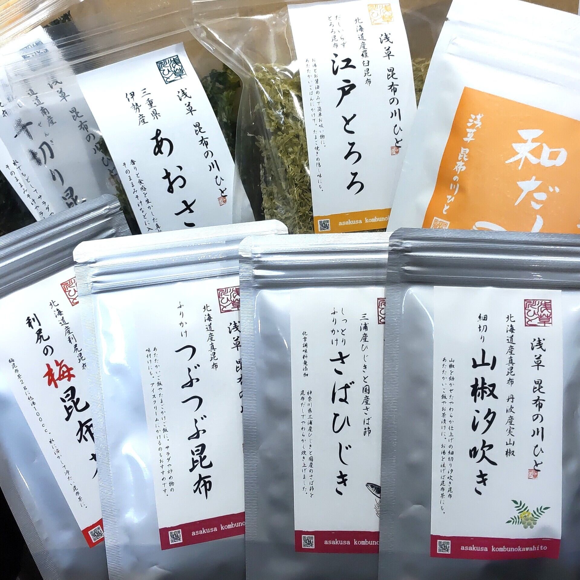 【セット内容】 ①和だし8g×15包、②江戸とろろ60g、③千切り昆布1枚、④あおさ10g、⑤細切り山椒汐吹き20g、⑥さばひじき40g、⑦ふりかけつぶつぶ昆布25g、⑧利尻の梅昆布茶70g
